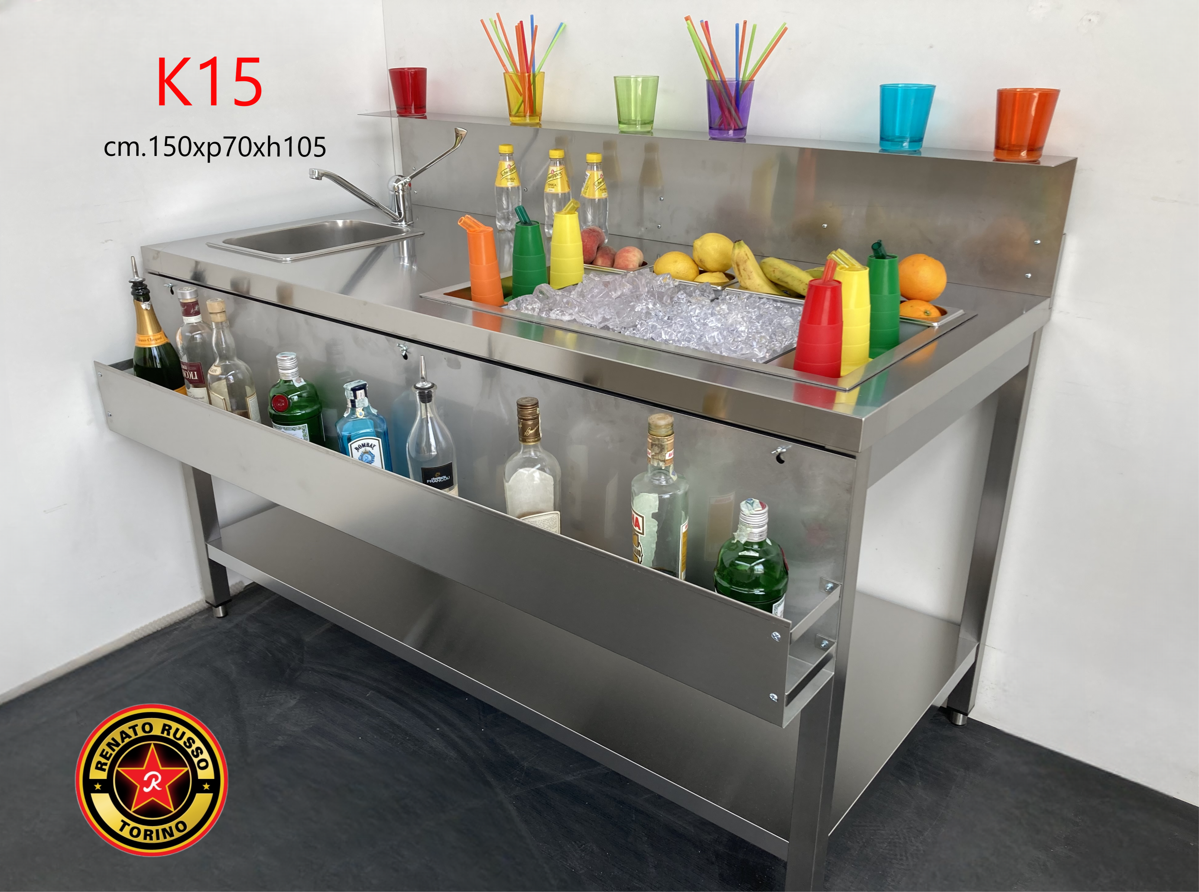 Nuova cocktail station per barman professionisti, postazione capiente completa. Granda vasca per ghiaccio, divisori estraibili, portabottiglie, pianetto - bancalina di servizio clienti, lavamani, miscelatore ... Modello K15 VEDI TUTTO QUI |